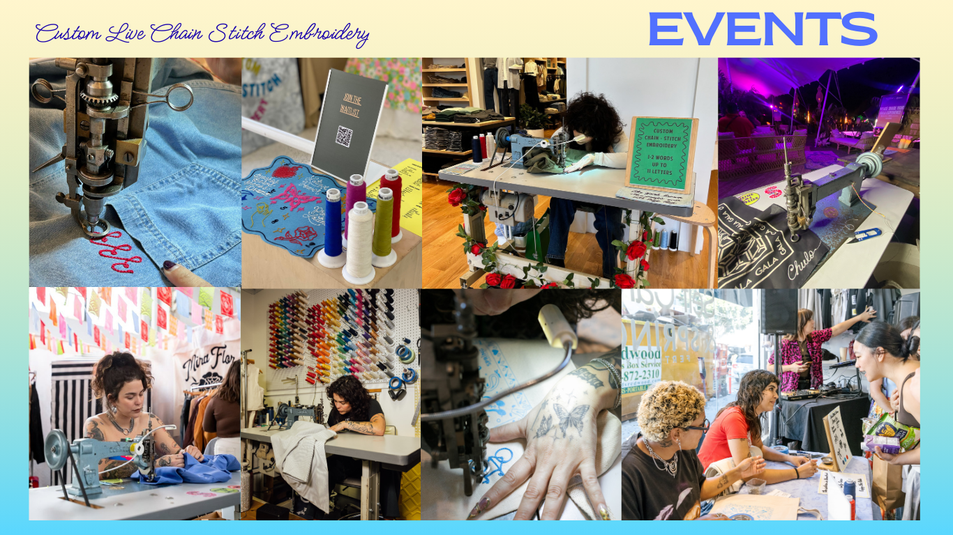 Our tailors specialize in chain stitch embroidery and denim tailoring. Orders can be placed online, in person at our store, or done on the spot when we embroider at events.