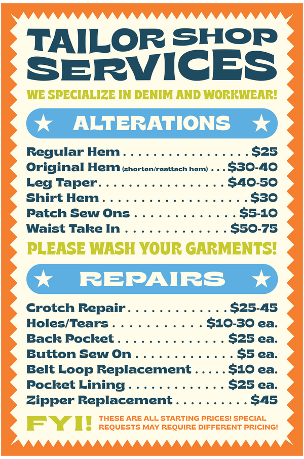 Our in-house tailors have a background working at Levi's and they specialize in denim tailoring. We can only take tailor orders at our physical store location. Browse through our services and please come in person for a fitting. We're open Weds-Sun, 11am-6pm in Temescal Alley in Oakland.